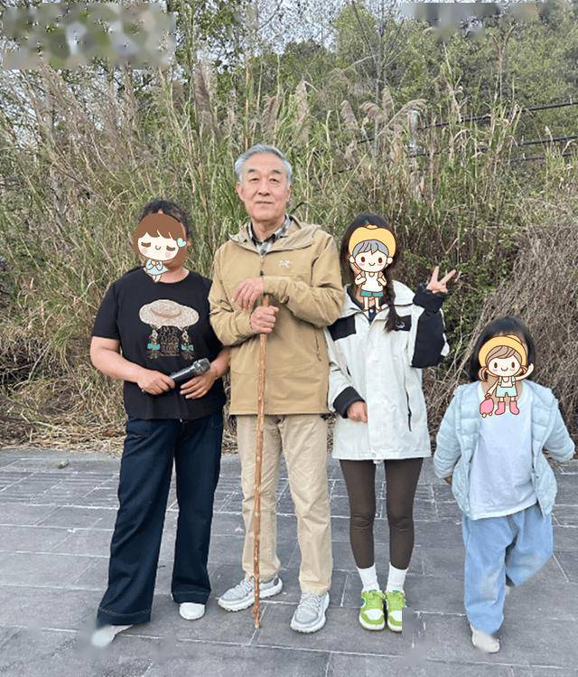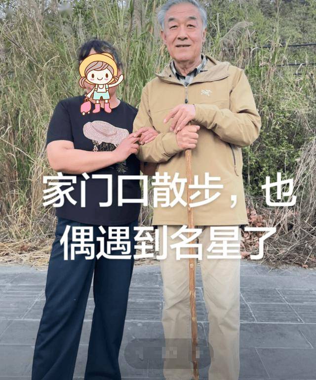 当日出门遛弯被偶遇到的李建义,他右手拄着一根木棍,左手被身旁女士轻轻挽住,动作舒缓从容,展现出年长者特有的沉稳与安详。他的身材清瘦挺拔,虽年近七旬仍保持良好的体态,气质儒雅内敛,透着艺术家的温润与平和。