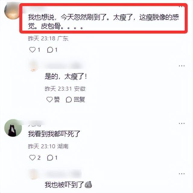 有网友直言“瘦成这样肯定是ed了,看着太吓人了,好好的姑娘别折腾自己”、“她原来可是和范冰冰一挂的浓颜美女,现在这模样,真的太让人唏嘘了”。
