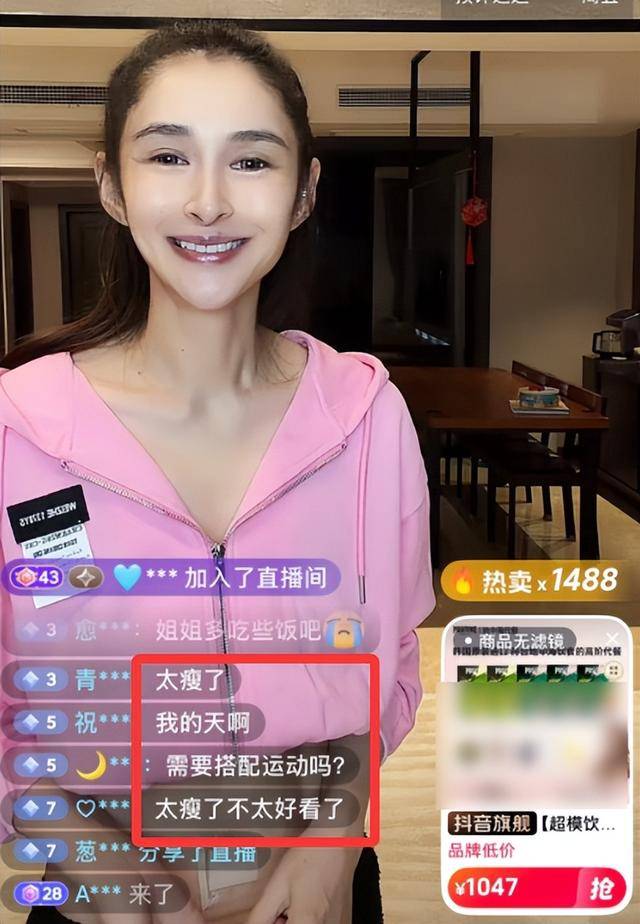从网友晒出的直播截图里能清楚看到,她穿了一件简单的宽松休闲上衣,可就算是这么宽松的衣服,也撑不起来,肩膀削瘦得厉害,胳膊细得像根竹竿,整个人看着轻飘飘的,一点精气神都没有。