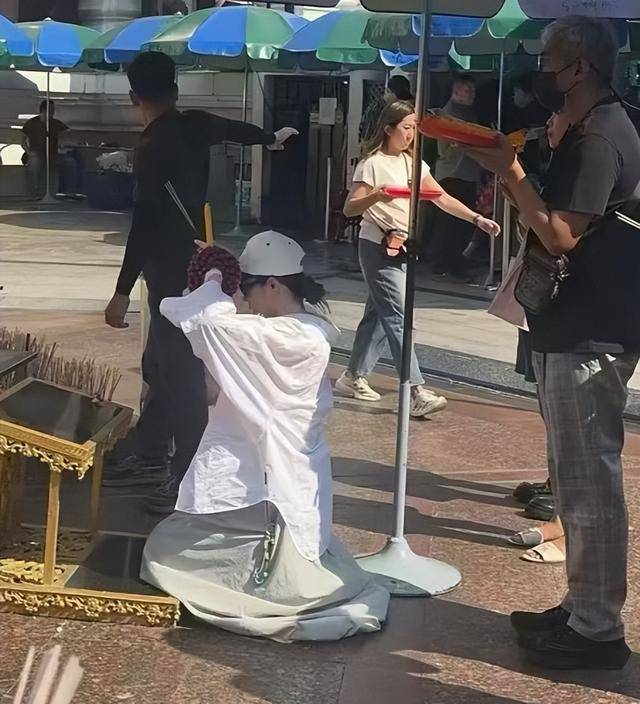 42岁的她,在大热天里穿着皱巴巴的白衣服,毫无顾忌地跪在地上上香,周围全是中国游客,她却半点不遮掩,这份虔诚,着实让人意外。