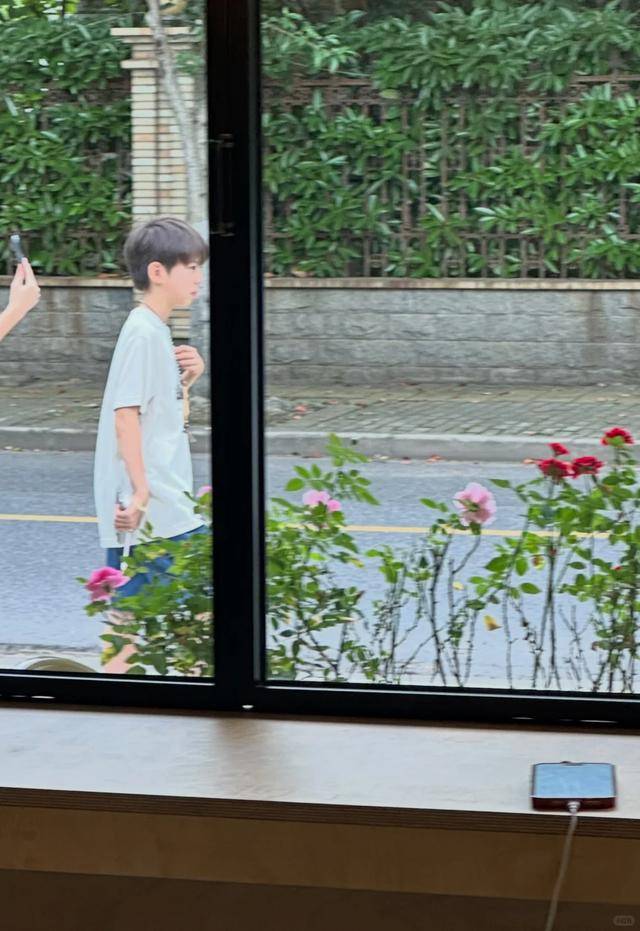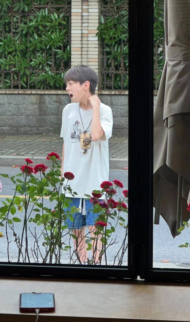 他穿了一件简单的白T恤,搭配一条牛仔短裤,穿搭清爽又帅气,只是模样跟小时候比,变化确实不小。