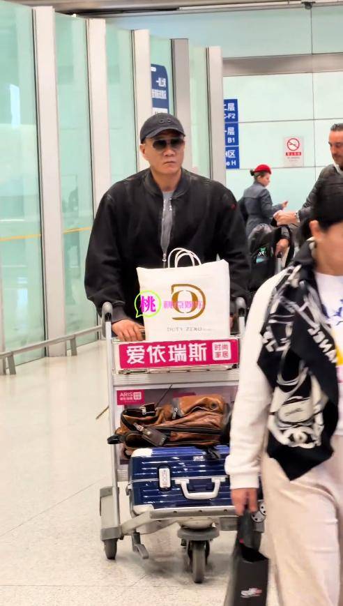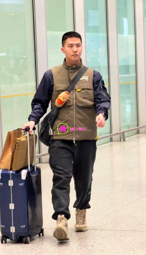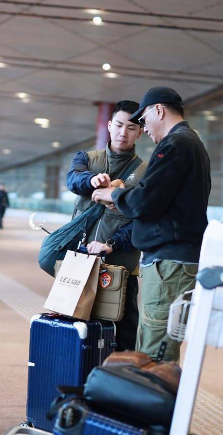 父子俩并肩走在机场大厅里,身高几乎持平,康康完美继承了父母的优良基因。