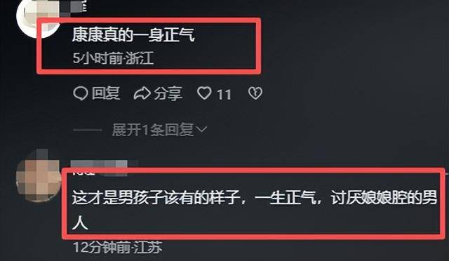 有网友留言说:“康康很优秀,一身正气,但和胡军比,还是少了点爸爸的气场,不如爸爸有气质。”