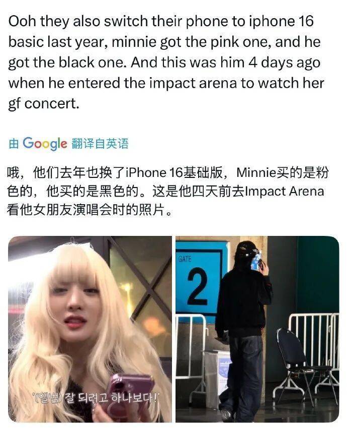 网友称两人存在“同款手机型号(iPhone 16 Basic)”“同款帽子/服饰”“共同参加泰国朋友婚礼”等细节,并称Minnie频繁返回曼谷与男方私下见面。但未提供亲密合照、私下行程重合等实质性证据,且被指同款物品在泰娱圈较为普遍。