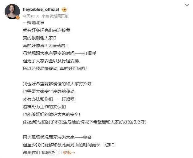 在抵达首都机场后,李圣经主动停留20-30分钟与粉丝交流,全程保持微笑,毫无明星架子。她耐心询问粉丝推荐的北京特色美食,重点提及烤鸭和炸酱面,并好奇表示想尝试豆汁挑战。面对现场人群拥挤,她配合安保快速离场,但通过微博强调已协调“在安全前提下尽量延长互动时间”,并承诺未来争取更多交流机会。