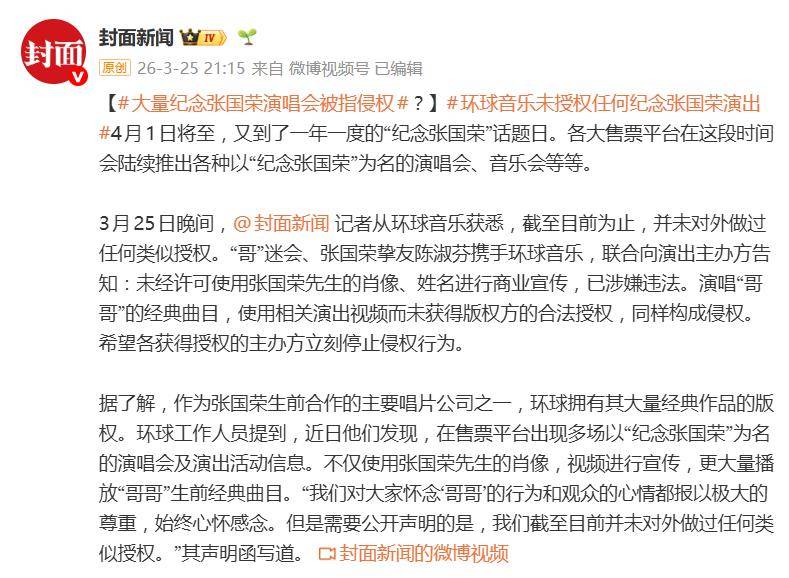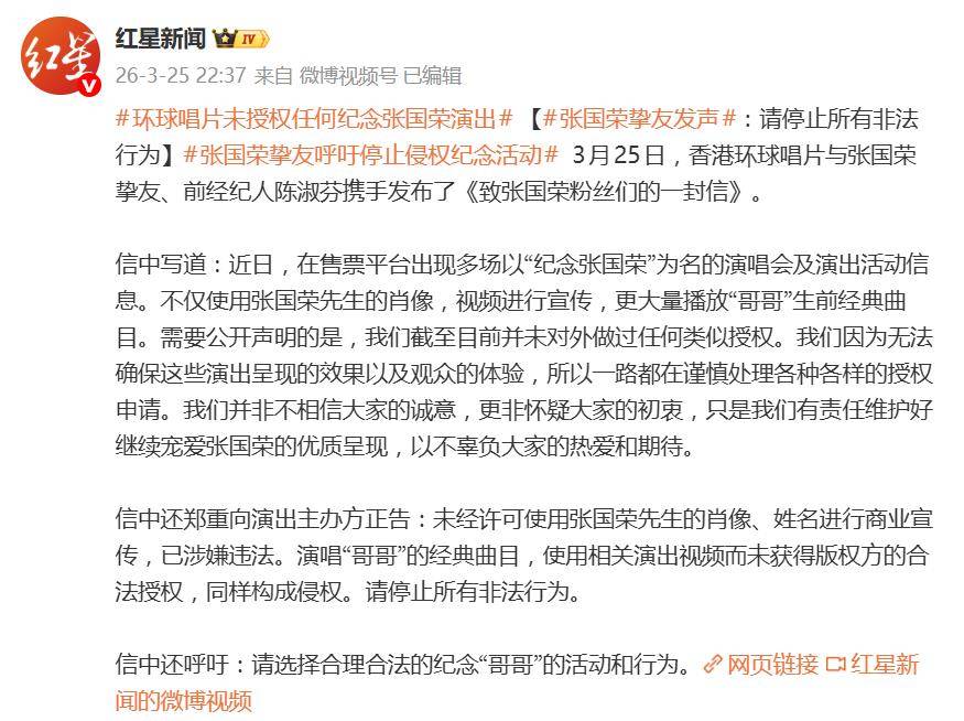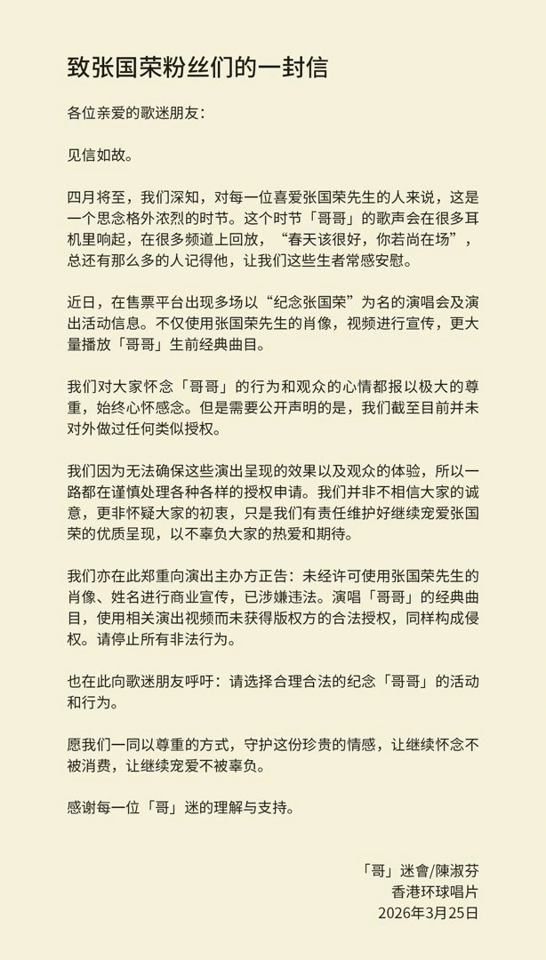3月25日,香港环球唱片与张国荣的挚友及前经纪人陈淑芬联合发布《致张国荣粉丝们的一封信》,态度鲜明地正告市场:截至目前,未授权任何以“纪念张国荣”为名的商业演出。