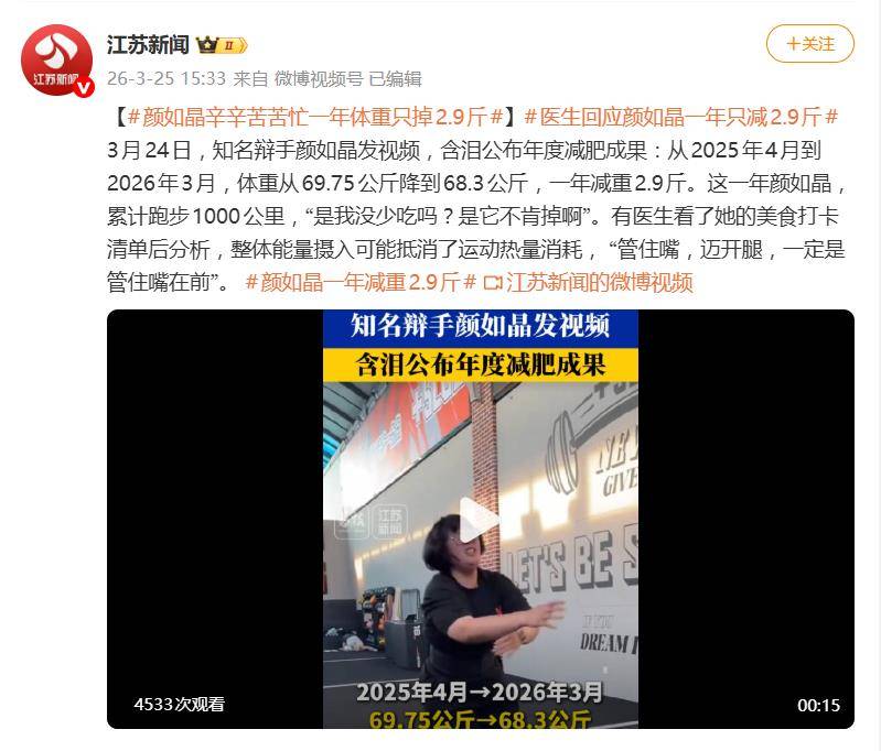 据3月25日报道,3月24日,知名辩手颜如晶的一条含泪视频,在社交平台炸开了锅。视频里,她哭红鼻子,委屈地公布了自己的年度减肥“战绩”:从2025年4月到2026年3月,体重从69.
