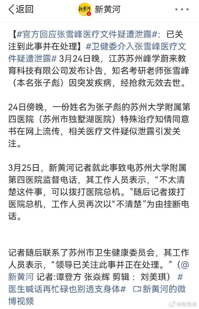 据悉,张雪峰是因为在公司内的跑步机上突发意外,由此被送往医院,在这个过程中,不管是相关的细节还是治疗信息都属于个人隐私,如果泄露,必然会受到法律的制裁。