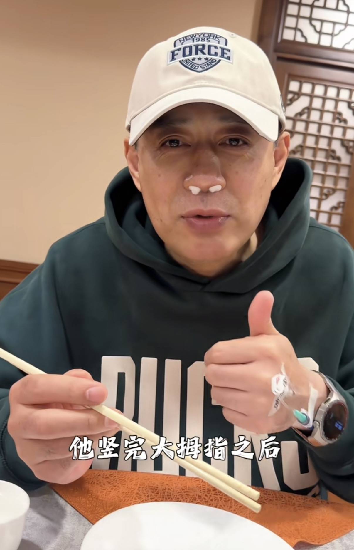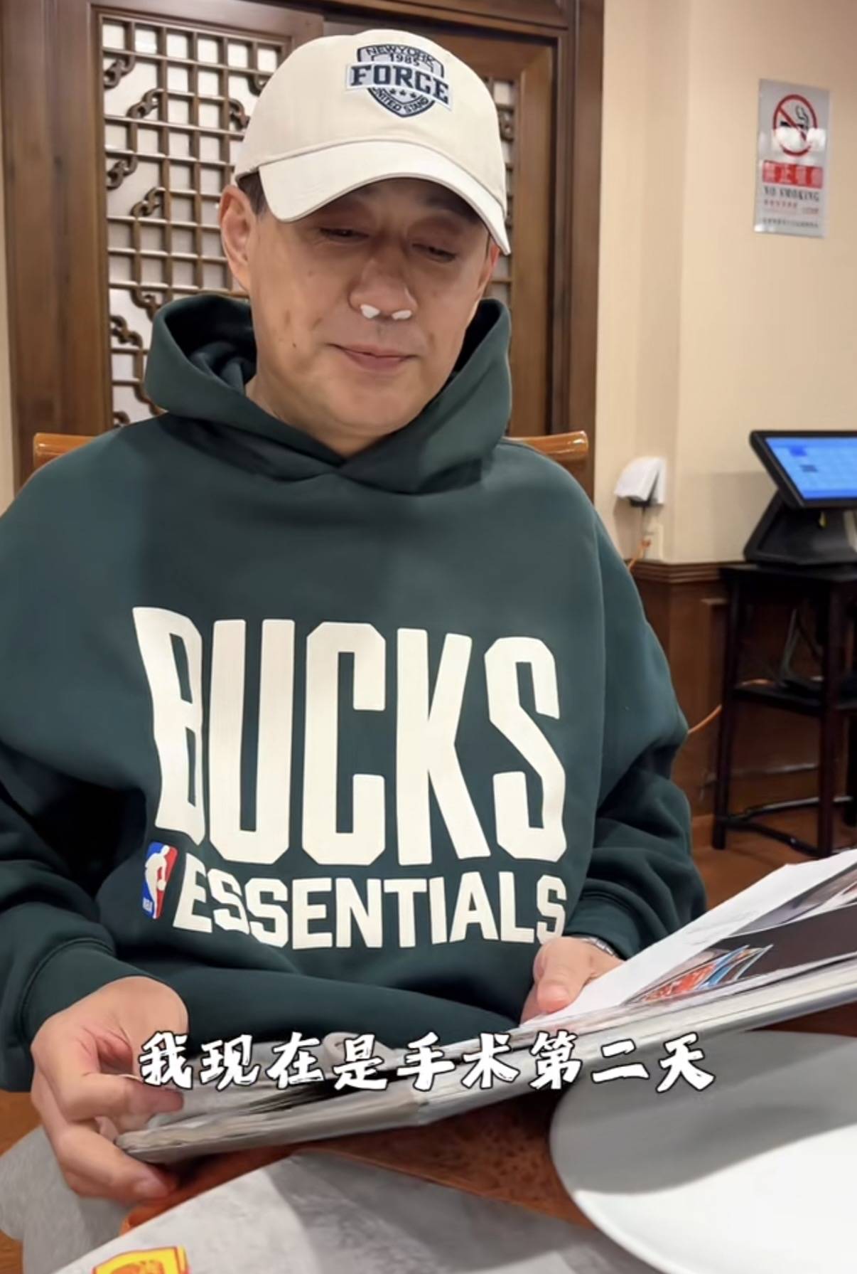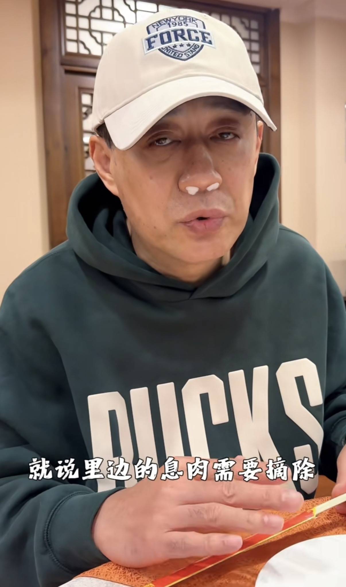 刘钧的视频中,他穿了一件墨绿色的连帽卫衣、带着棒球帽,鼻子里还塞着两个棉球。虽然是刚做完手术,但刘钧看起来气色还不错。