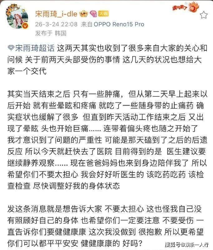直到3月24日,在症状持续恶化,甚至出现短暂视觉模糊后,宋雨琦才终于得以就医。医生的诊断结果是“撞击引发的脑震荡后遗症”,并给出了明确的指令:必须暂停工作,静养观察,避免用脑和体能消耗。同一天晚上,她在社交媒体上发文,向粉丝道歉,坦言自己“没有照顾好身体”,并透露父母已赶到身边陪伴。而她的经纪公司CUBE娱乐,在舆论发酵的压力下,才发布了一份姗姗来迟的公告,声称“后续安排以艺人恢复健康为最优先考虑”。