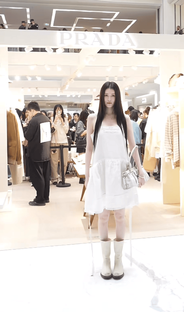 晒出的现场视频中,何穗站在Prada门店前,整体造型简约而富有高级感,完美展现了其标志性的修长身材与优雅气质。