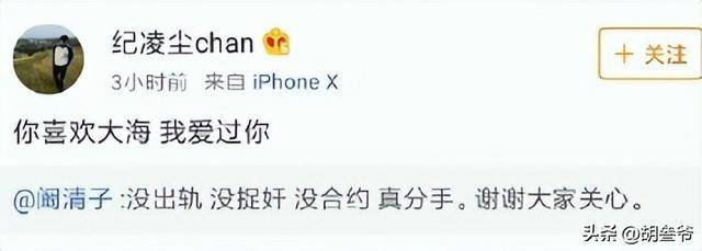 2018年7月31日,阚清子直接官宣分手,文案干脆利落:“没出轨,没捉奸,没合约,真分手,谢谢大家关心”。