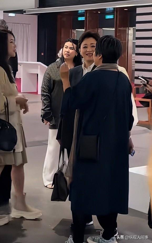 袁咏仪身穿阔腿裤套装干练大气,丸子头造型衬得气色红润,张智霖身着深色休闲西装,依旧是帅气不减的不老男神。