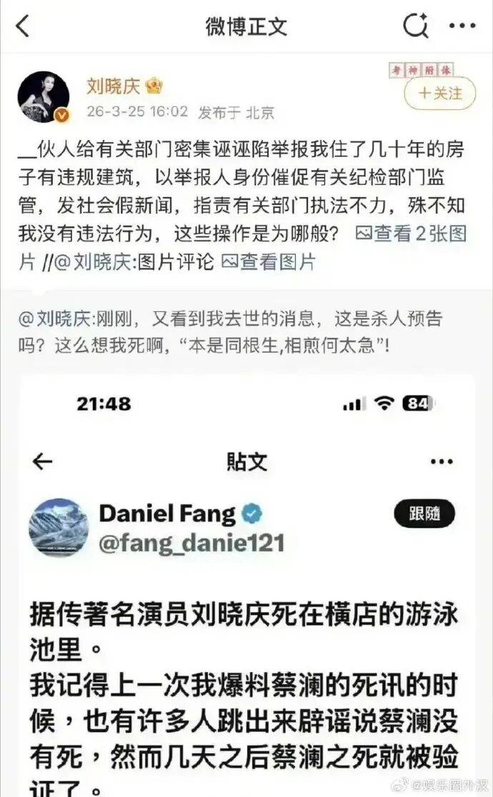 3月25日,刘晓庆公开指认亲外甥靖然是境外账号"Daniel Fang"的运营者,该账号散布其"死于横店泳池"的谣言,并称其长期联合他人诬告自己房产违建、窃取珠宝。