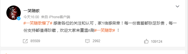 《一笑随歌》官微,也发微博,“感谢各位的关注和认可,家1倍感荣幸!每一份喜爱都弥足珍贵,每一份支持都值得珍藏,欢迎大家来重温n刷”