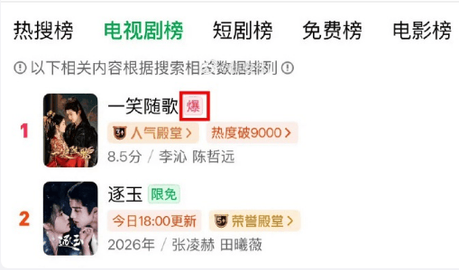 2026年3月26日,一部在2025年10月首播时最高热度仅9158的古装剧《一笑随歌》,竟在播出169天后以近40%的飙升幅度空降爱奇艺热搜榜和电视剧榜双榜第一,热度破9000点,成为平台首部