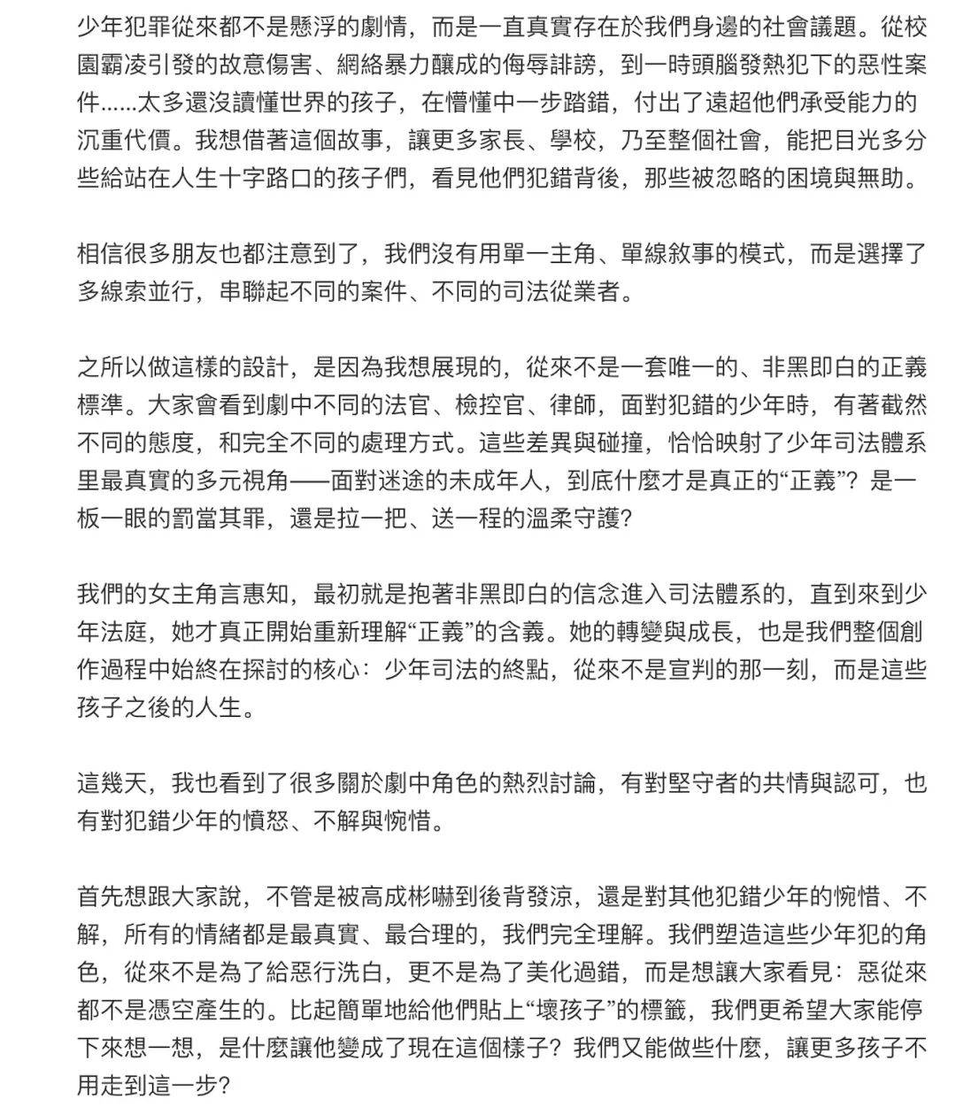 他在文中提到,自己一直有留意弹幕和评论区,也看到不少观众为剧中的案件揪心,为角色的坚持动容。对创作者来说,观众愿意跟着剧情去思考案件背后更复杂的东西,其实比单纯追求热闹更珍贵。
