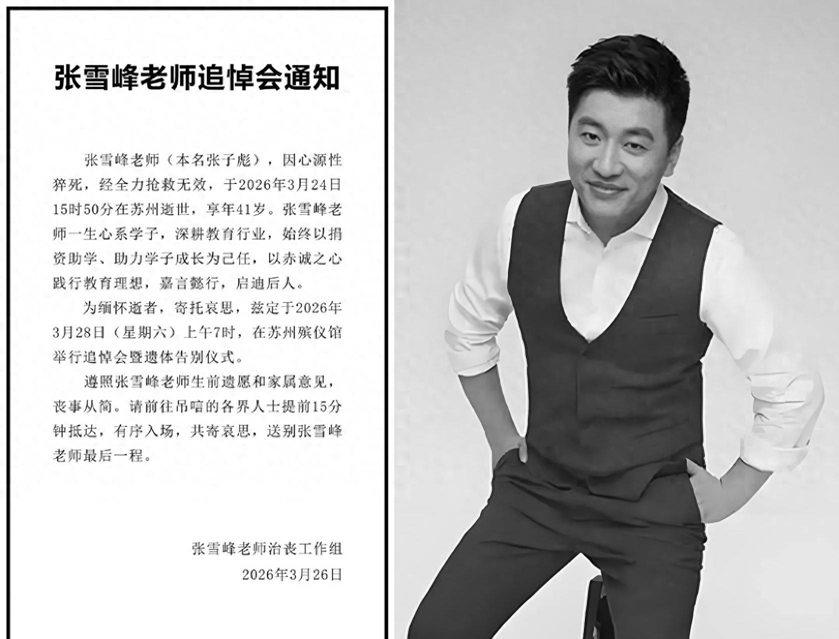 在另一边,张雪峰的遗照静静地摆放着,是一张身穿西装的彩色照片,看到这张遗像,不少网友都泪目了,他还那么年轻,走得太突然了。