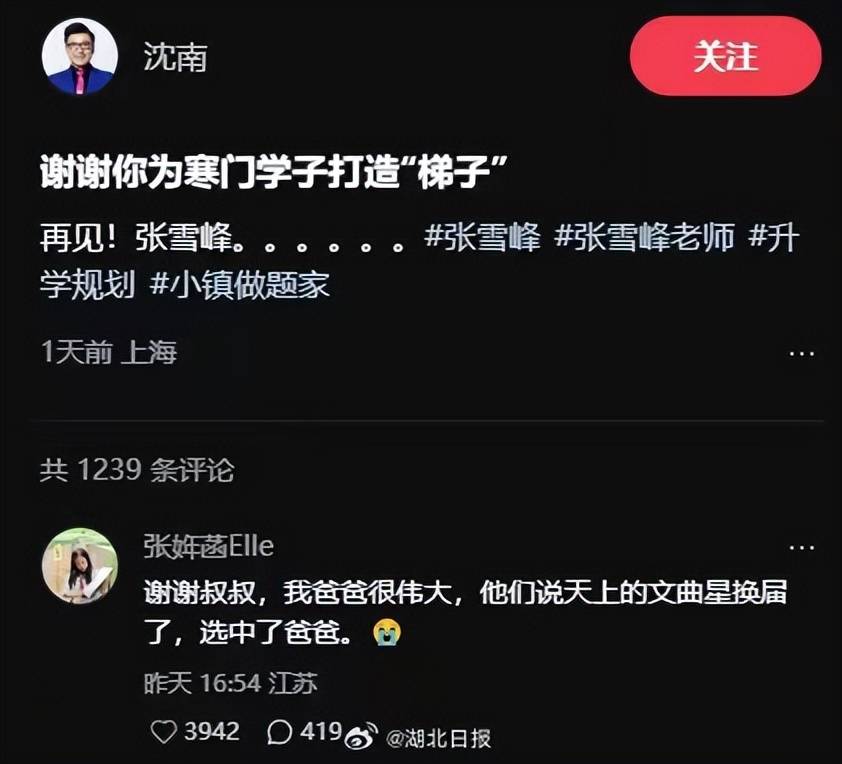 主持人沈南发文悼念张雪峰,女儿张姩菡回复:“谢谢叔叔,我爸爸很伟大,他们说天上的文曲星换届了,选中了爸爸。”