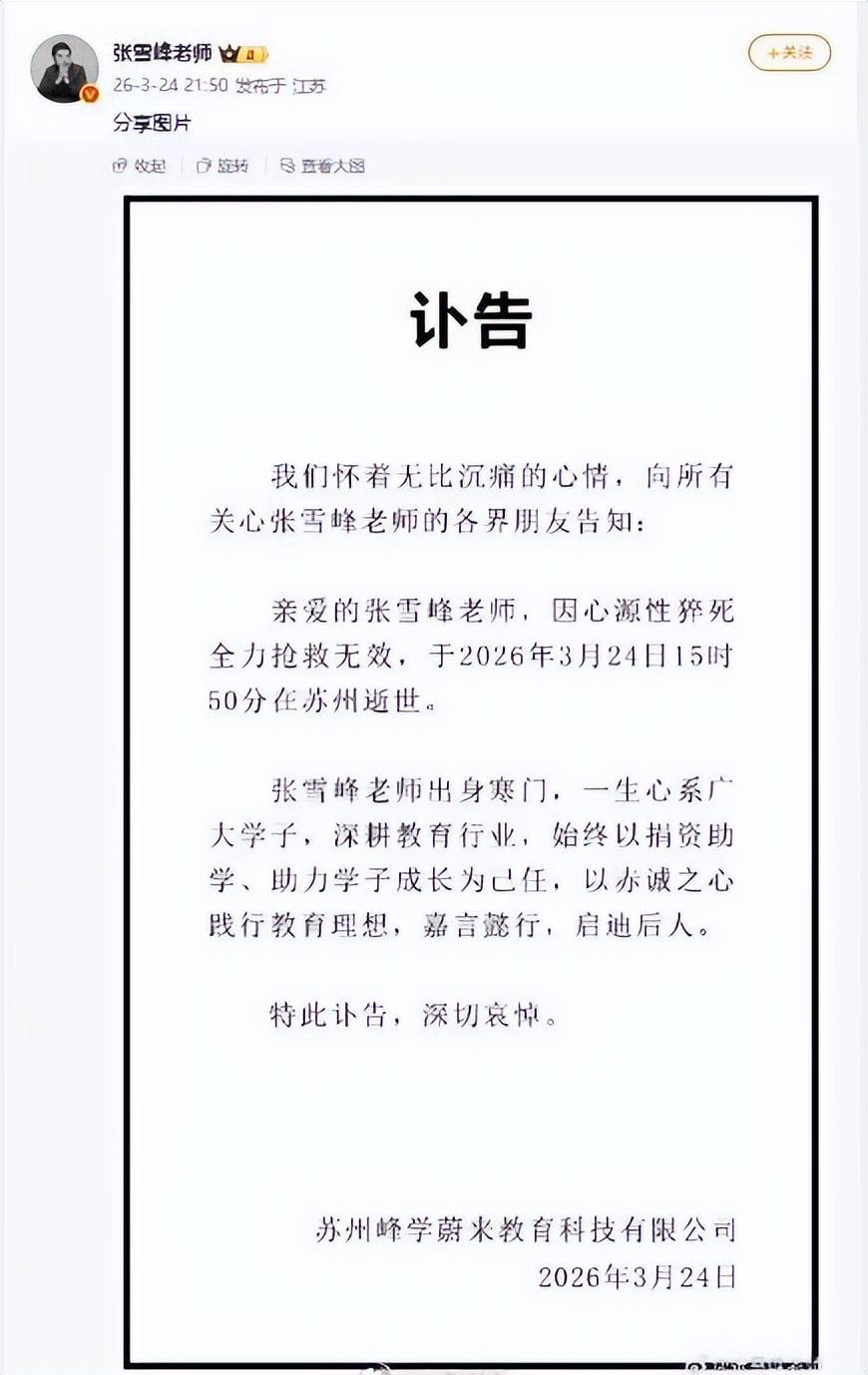 苏州峰学蔚来教育科技有限公司于2026年3月24日发布讣告,确认张雪峰因心源性猝死,经抢救无效,于2026年3月24日15时50分在苏州逝世。