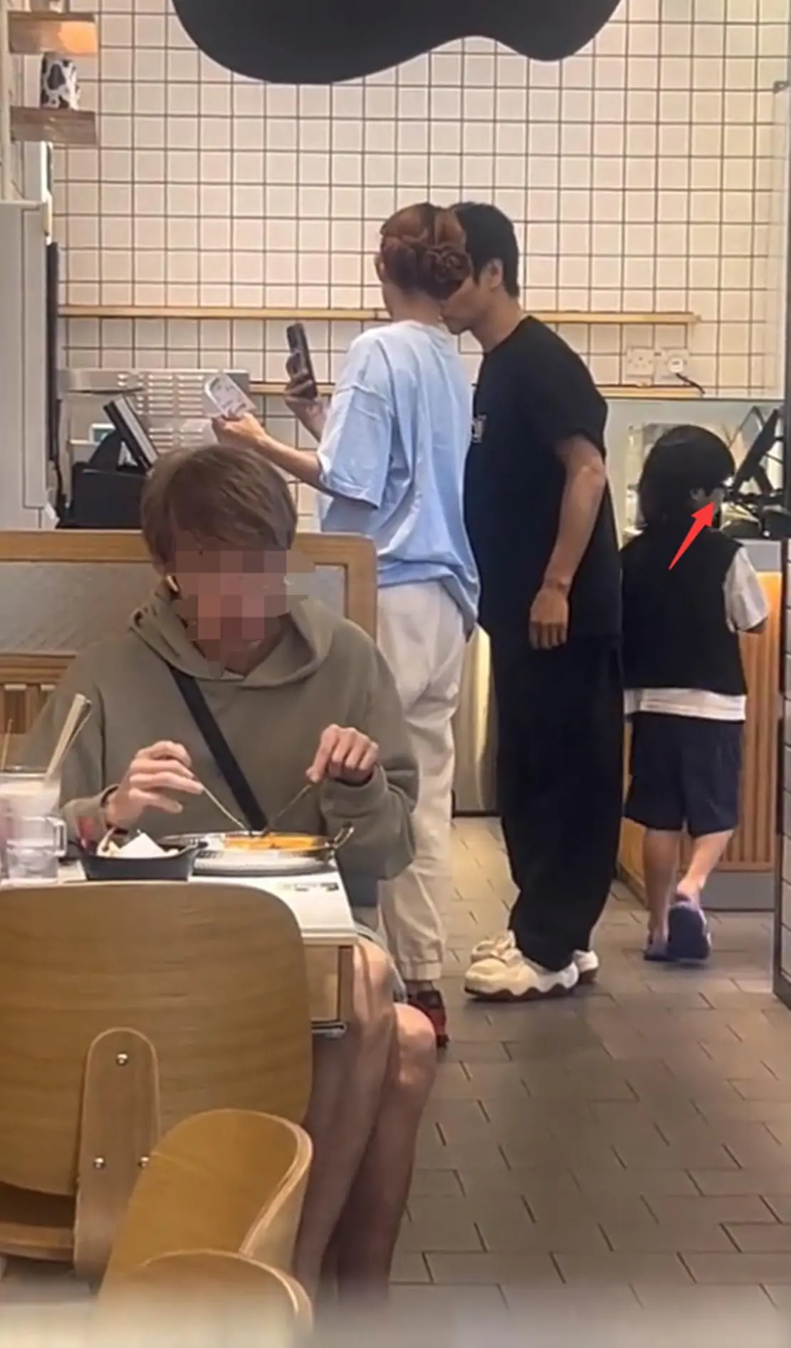 张晋带着幼子跟在她身后,买单前蔡少芬还回头把手机递给张晋看了一眼,大概是账单或者什么需要确认的东西。