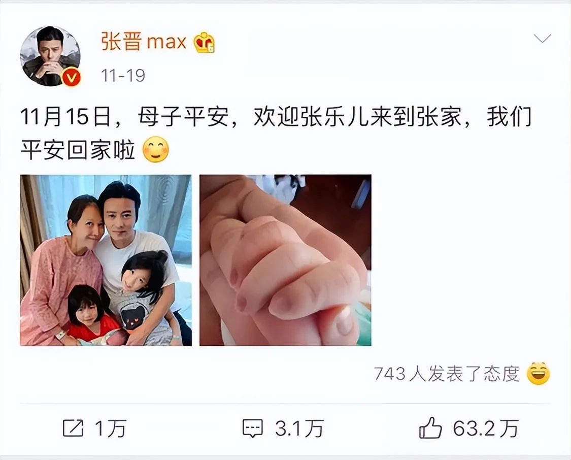 2019年11月19日,张晋在微博发出消息,宣布蔡少芬产下三胎——儿子,取名张乐儿。