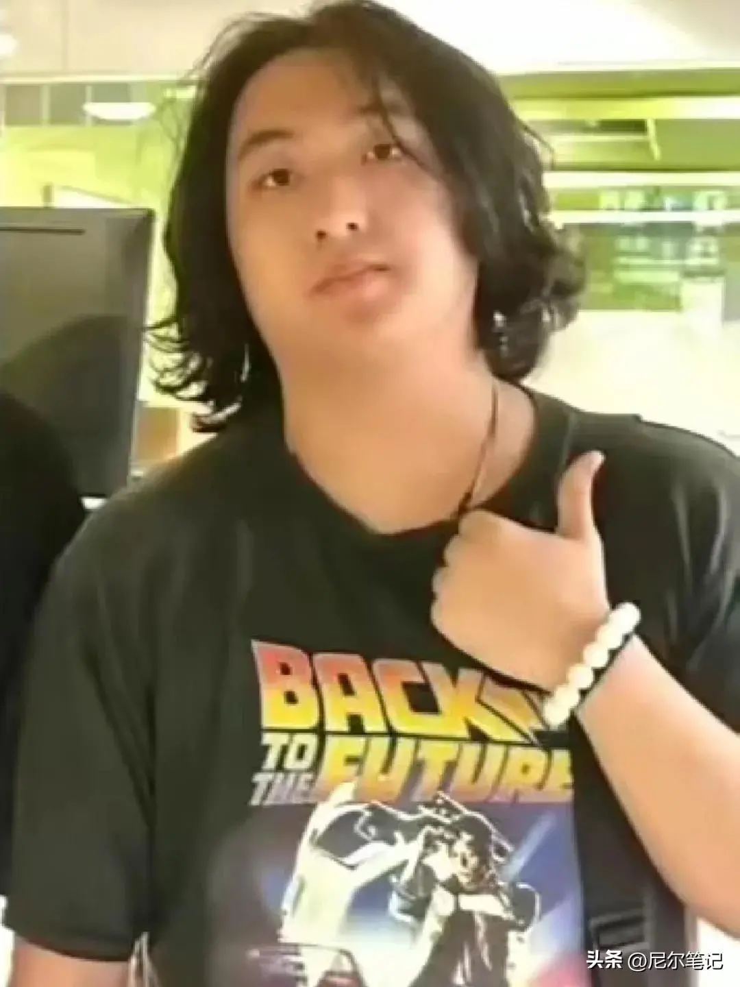 再看他的造型,一身宽松的黑色短袖搭配黑色阔腿裤,脖子上还随意搭着一条黄色毛巾,留着一头及肩的长发,整体风格随性又粗犷,和小时候清爽可爱的样子,完全是两个极端。