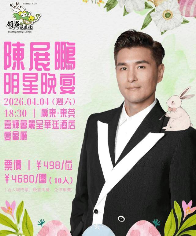 4月,陈展鹏将在东莞举办复活节晚宴,票价曝光分别是单人票 498 元、10 人桌 4680 元,含粤式晚餐 + 现场演唱 + 近距离互动。