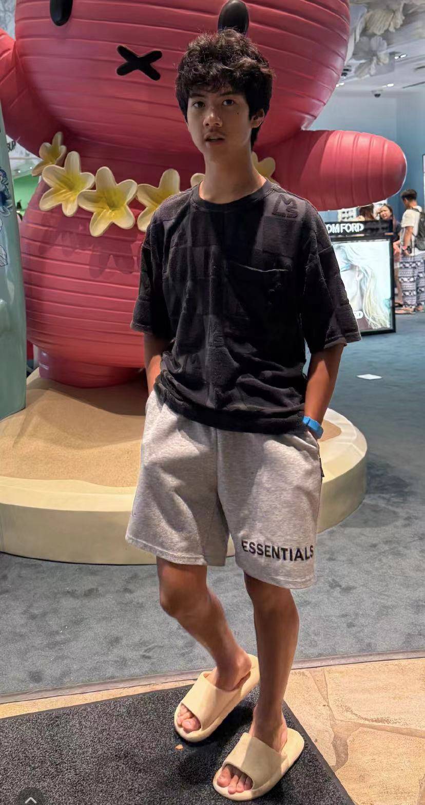 Jagger和妈妈站在一起,明显已经高过165厘米的刘芸,他皮肤偏黑,蓬松卷发很黑,看起来像混血儿,遗传了父母的优点,对比2025年7月东京画展时的抓拍,更显阳光和自信。