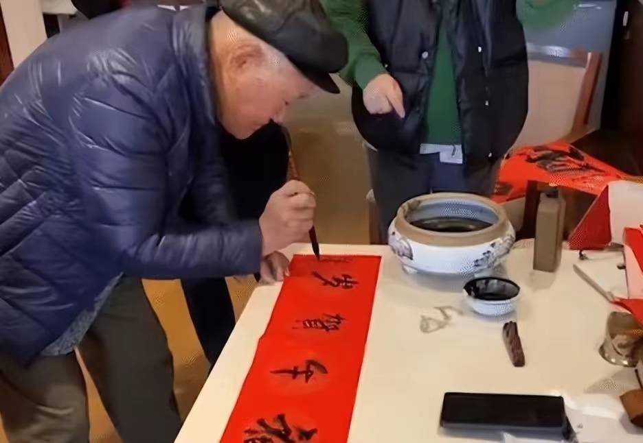 牛犇是一位老艺术家,闲来无事也会和养老院的老老伙计们一起写毛笔字,他的书法不错、大家看着都赞不绝口。