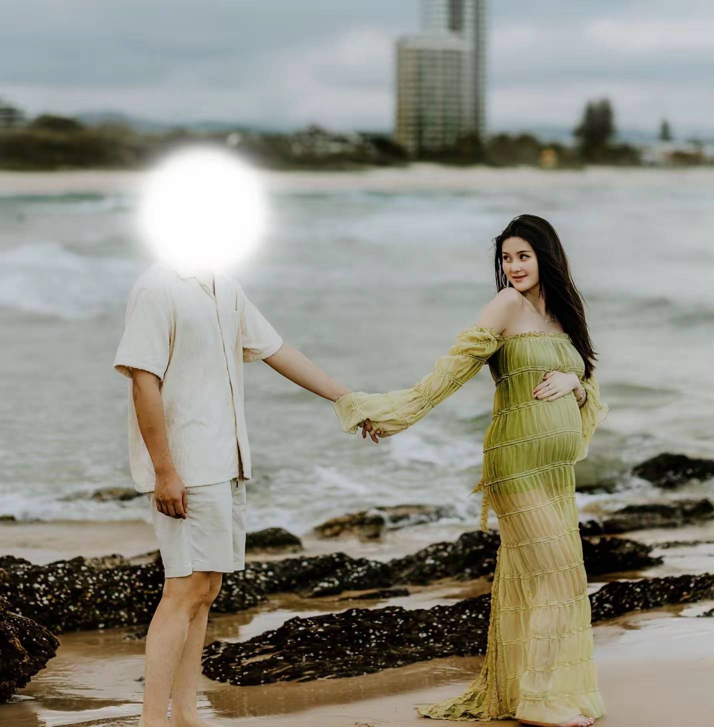 首先他晒出了廖思维的孕肚照,两个人在海边拍下温馨的一幕。廖思维穿着一字肩的纱裙,看向男士的神情满是爱意。