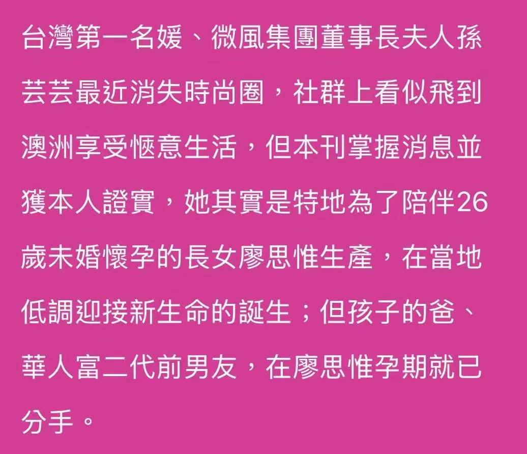 也就是说,在媒体的思路里,廖思维应该是刚生产完没多久,孙芸芸一人前往照顾女儿,是因为那个孩子爸、被指的“华人富二代”在廖思维孕期跑路。