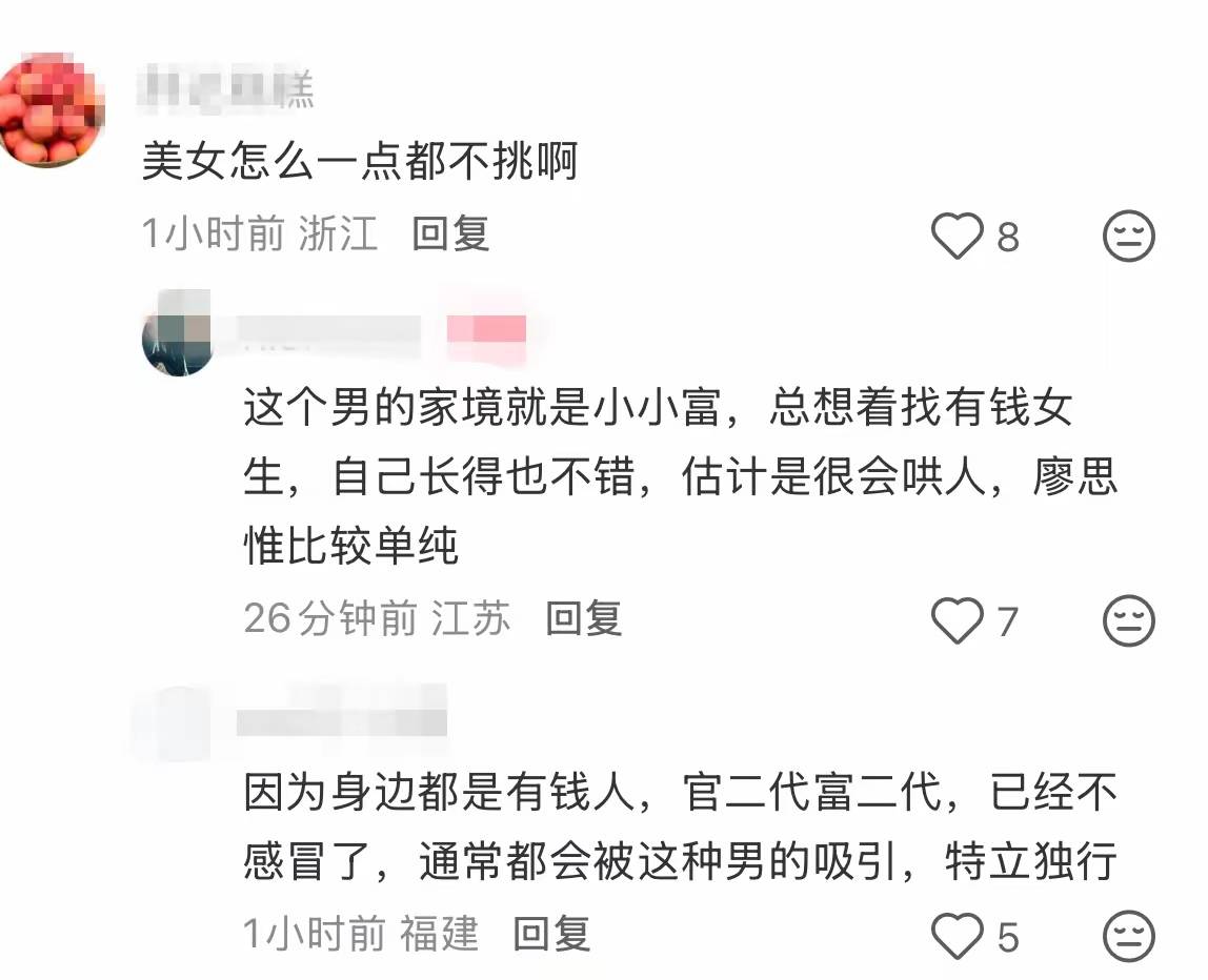他穿着一件黑色T恤,和廖思维亲密的合影。廖思维很漂亮,大眼睛、白皮肤、高鼻梁,看向镜头里的眼神也满是欣喜。
