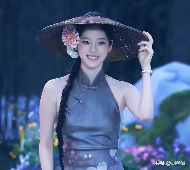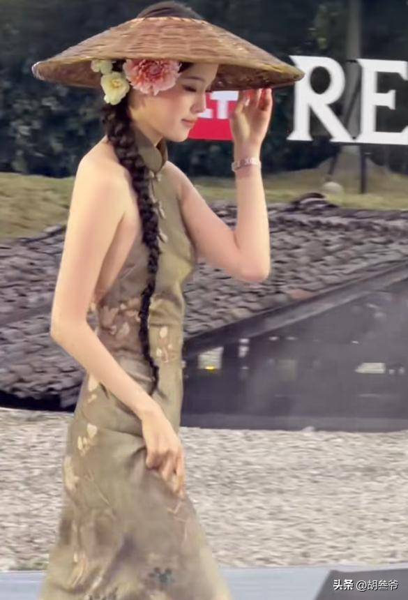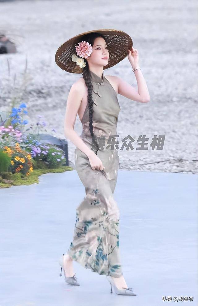 她以“斗笠簪花”的造型亮相,把传统的斗笠和鲜花元素结合在一起,搭配一身清新的绿色长裙。