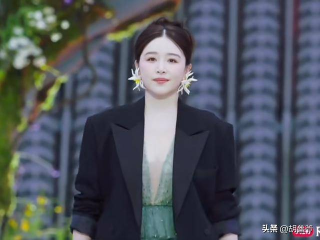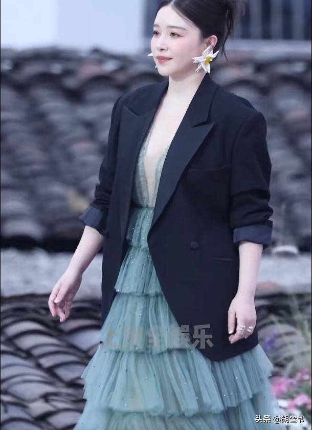 本来大家都特别期待她的状态,结果她穿了一身蓝绿色的蓬蓬长裙,还在外边搭了一件黑色西装,看着有些臃肿。