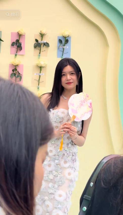 当天她穿了一件抹胸款式的礼服,裙摆上有立体花朵装饰,原本是想走温婉路线,可效果却不尽如人意。