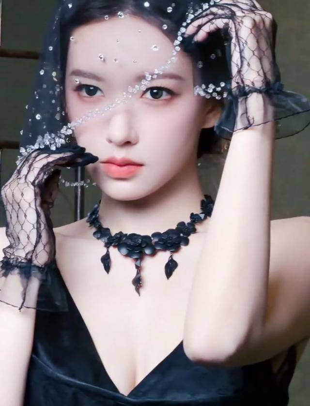 最吸睛的还是她头上的黑色头纱,薄薄一层垂在额前,遮住了部分眉眼,增添了几分朦胧美和神秘感。