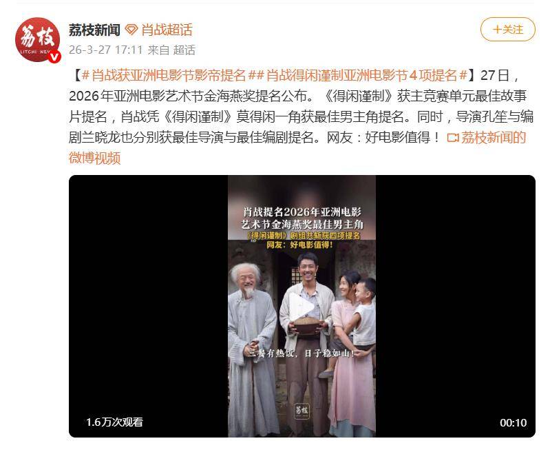 据3月27日报道,2026年亚洲电影艺术节“金海燕奖”提名名单的公布,在网络上投下了一枚惊喜炸弹。焦点中的焦点,是演员肖战——他凭借在电影《得闲谨制》中