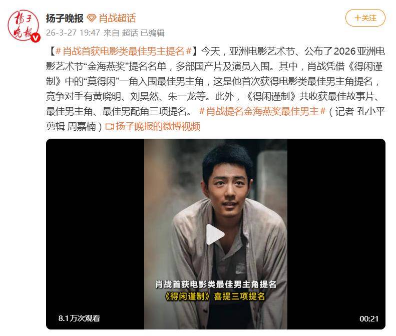据3月27日报道,2026年亚洲电影艺术节“金海燕奖”提名名单的公布,在网络上投下了一枚惊喜炸弹。焦点中的焦点,是演员肖战——他凭借在电影《得闲谨制》中饰演的“莫得闲”一角,首次获得电影类最佳男主角提名,将与黄晓明、刘昊然、朱一龙等实力派同台竞技。