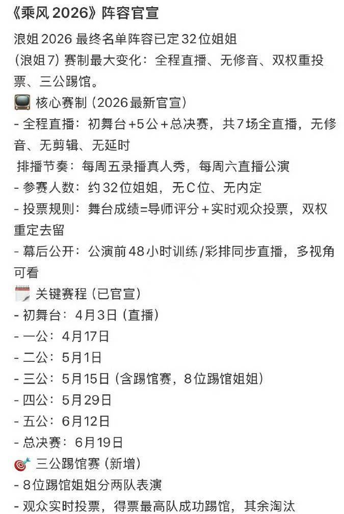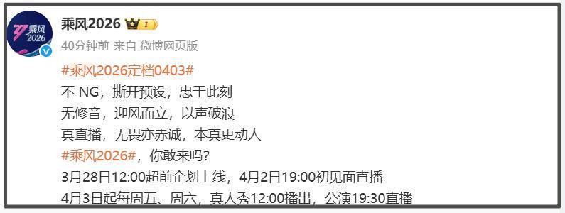 博主的曝料也得到了证实,3月27日,《 浪姐7》节目组正式官宣定档,无修音、真直播,3月28日12:00超前企划上线,4月2日19:00初见面直播,4月3日起每周五、周六,真人秀12:00播出,公演19:30直播。