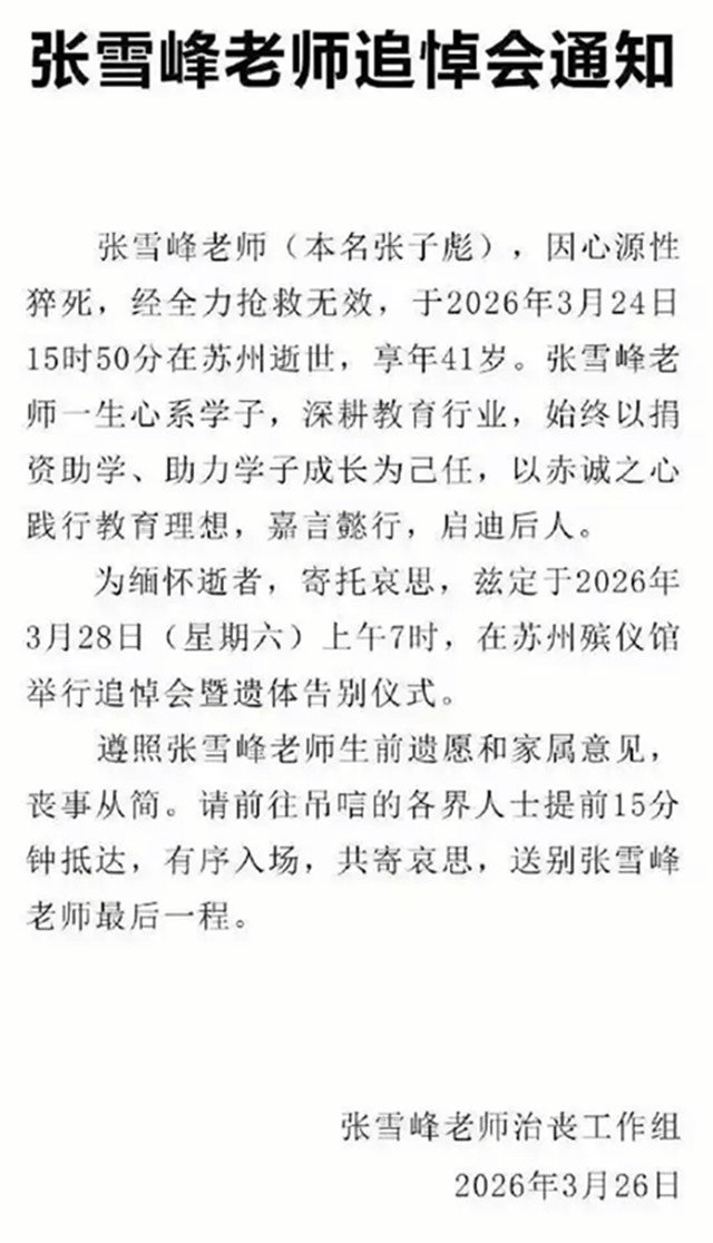 3月26日凌晨,当大多数人还在睡梦中,张雪峰治丧工作组发布了一则公告,确认追悼会暨遗体告别仪式,将于3月28日上午7时,在苏州殡仪馆松柏厅举行。