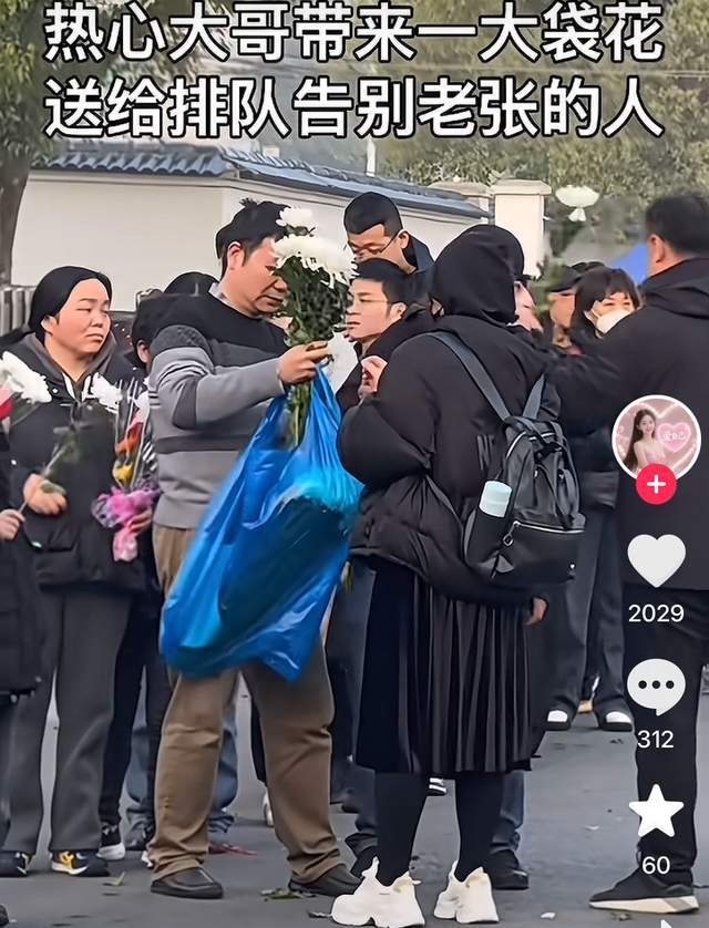鲜花好似成为当天最珍贵的东西,由此便上演了让人感到暖心的画面。殡仪馆内外侧都摆放着鲜花,也正是基于这样的考虑,有一位大哥特地从很远的地方带来了白色菊花,他并没有凭此赚钱,而是将其分给那些没有花的悼念人群。