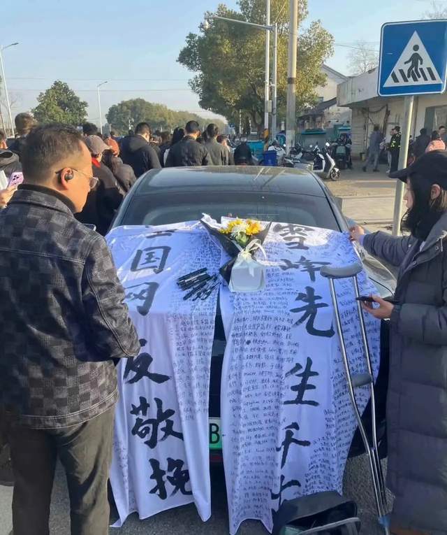 一辆黑色的轿车上方,摆放着两块白布,上面赫然写着:全国网友敬挽,学风先生千古。
