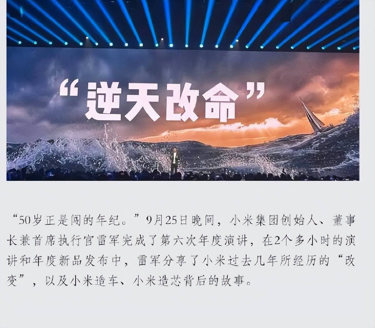 这并非普通的个性壁纸。科技博主辨认出,该设计精准复刻了雷军2025年9月年度演讲“改变”的现场PPT视觉风格,相同的字体与灯光元素,将其从一次性的演讲口号,固化成了每日可见的私人信条。演讲中,雷军反复强调“50岁正是闯的年纪”“持续努力就有机会逆天改命”,并以凡客创始人陈年50岁再度出发的创业故事佐证其理念。如今,这张壁纸将舞台上的宣言,变成了他掌中最私密也最公开的自我激励。