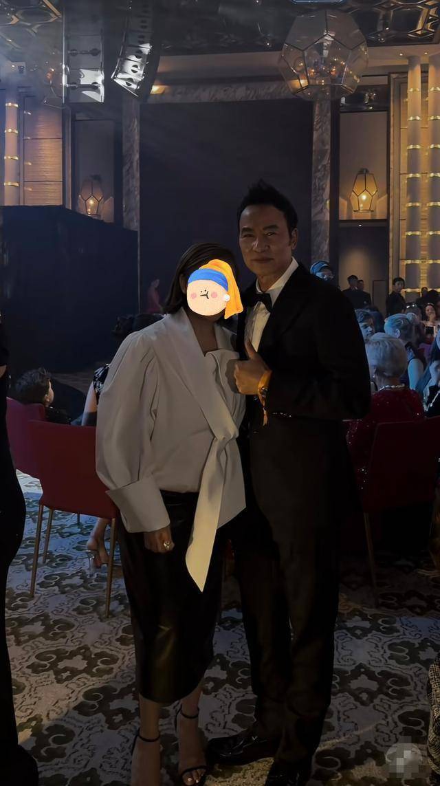 任达华则染了一头黑发,中间部分还用发胶竖了起来,视觉上显得个子更高了。他身穿白色衬衫,搭配黑色西装,脚穿黑色皮鞋,竖起了大拇指。