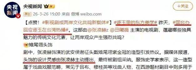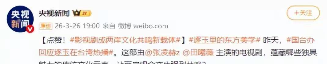几乎在同一时间,国台办也发声了。3月25日国务院台办例行新闻发布会上,发言人朱凤莲专门回应了《逐玉》在台湾热播的事。她说:“大陆的影视剧能够不断在台湾热播、受到岛内观众喜爱,充分说明中华文化是两岸同胞的根脉和归属。看了剧,自然而然就会对优秀的影视文化作品产生情感共鸣,这种文化认同和情感连接是任何人都割裂不断的。”这话说得多有分量。