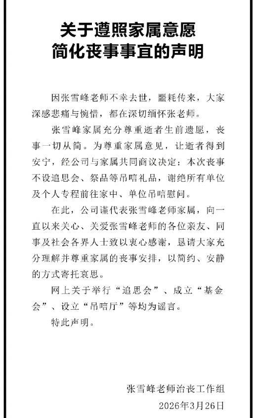 按照他生前的遗愿,治丧工作组早就发了声明,丧事一切从简,不设追思会,不接受任何祭品,甚至谢绝大家专程前往吊唁。