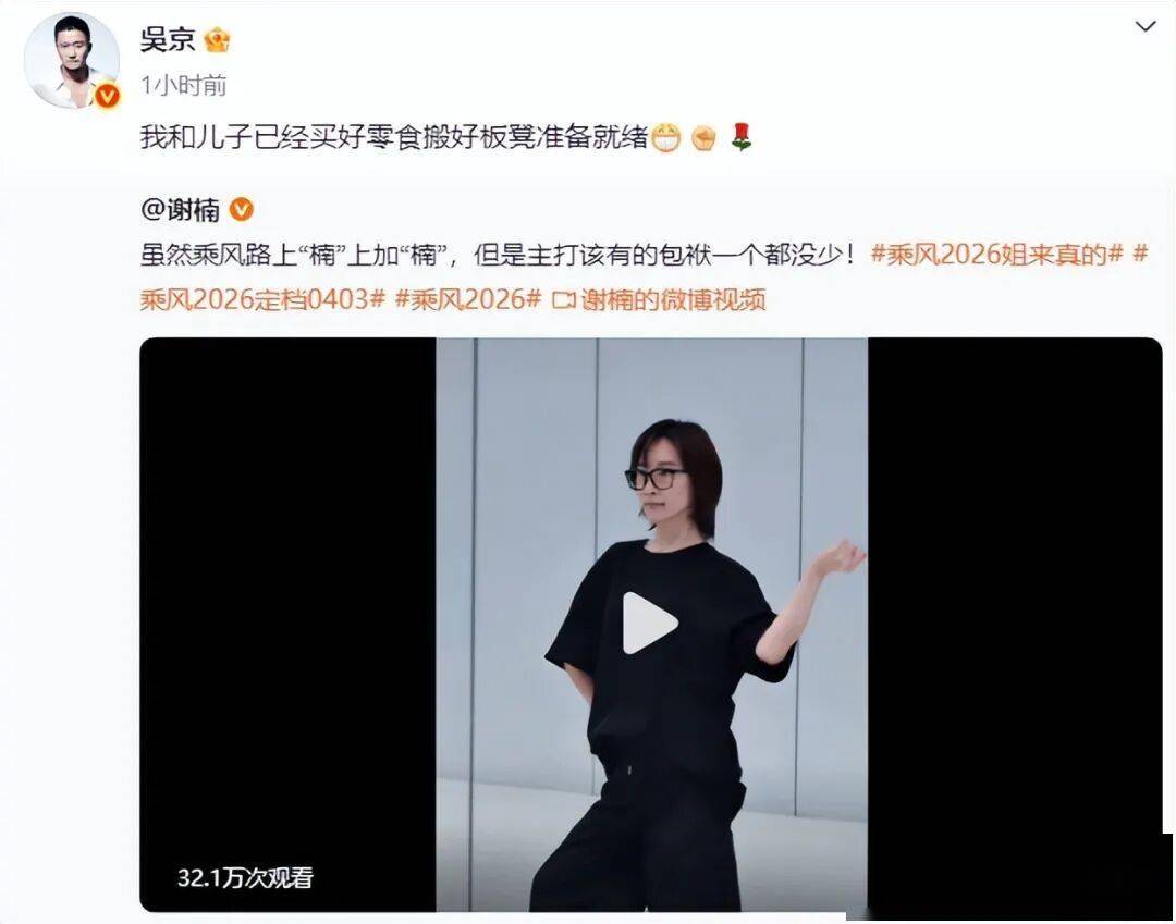 3月27日,谢楠在社交平台上发文官宣参加《乘风2026》,并配文称:“虽然乘风路上‘楠’上加‘楠’,但是主打该有的包袱一个都没少!”随后,吴京转发妻