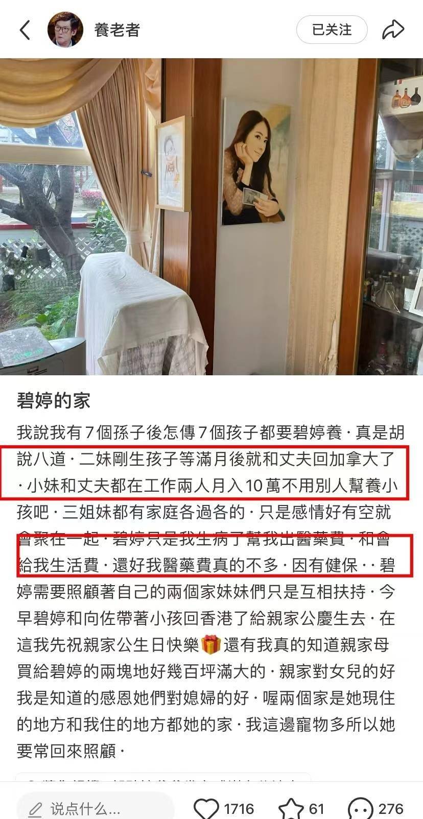 小女儿生了三个儿子,两口子收入也不低,能够维持自己的生活。小女婿会陪伴郭爸爸去医院检查,其实郭碧婷有空也会陪伴爸爸去检查。