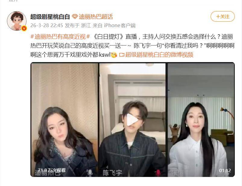 据3月28日晚间网友爆料,在热播剧《白日提灯》的直播中,迪丽热巴一句幽默自嘲,瞬间让“明星视力”成了全网热议话题。当主持人提问“若交换五感会选择什么”时,迪丽热巴调侃道,愿意将自己的高度近视“买一送一”送出去。搭档陈飞宇立刻顺势接梗,反问了一句:“那你拍戏的时候看清过我吗?”这一来一往的互动,不仅笑翻全场,也意外揭开了演员在光鲜镜头后的真实一面。